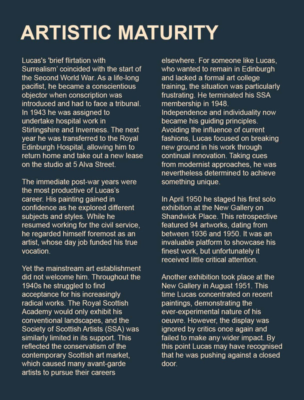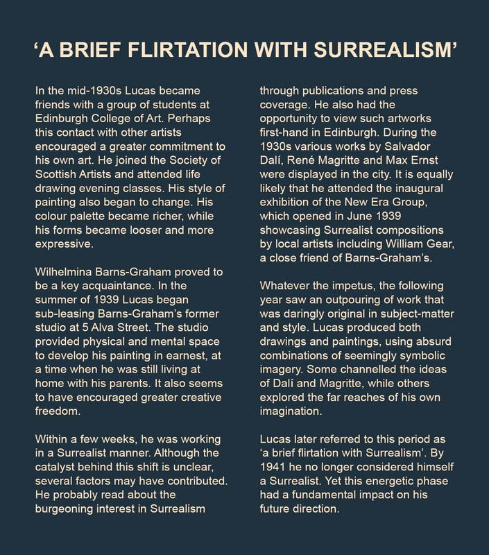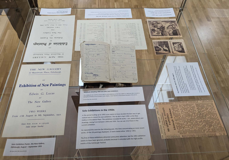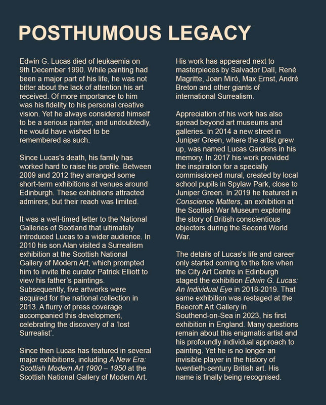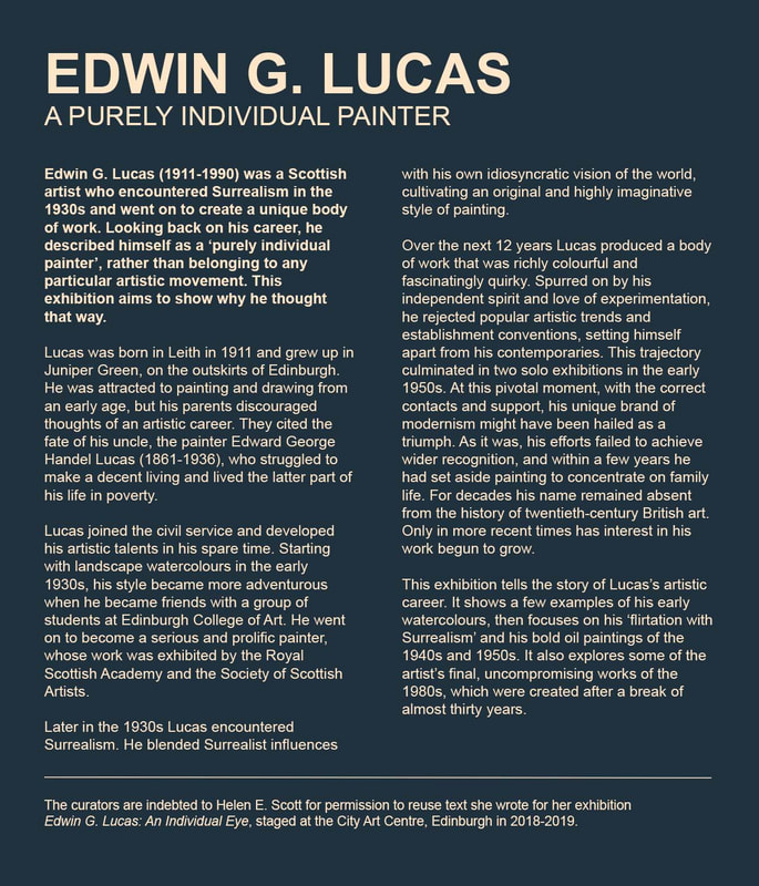 Edwin G Lucas: A Purely Individual Painter exhibition in HawickEdwin's first exhibition in the Scottish Borders, Edwin G Lucas: A Purely Individual Painter, was held at the Hawick Museum & Gallery, from 05 Jul - 05 Oct 2025. The exhibition featured over forty artworks drawn from public and private collections. It covered the whole of his career, but with a particular focus on his Surrealist period, from 1939-1941, and the unique body of innovative work he created later.